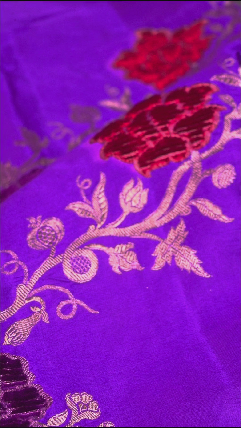Elevate your elegance with the Banarasi Mashru Silk Jaal Velvet Meenakari Saree in a rich purple hue. This exquisite saree combines the luxurious sheen of Mashru silk with intricate velvet jaal work and delicate Meenakari detailing, offering a timeless blend of tradition and artistry. Perfect for special occasions, it drapes gracefully to enhance your silhouette while showcasing refined craftsmanship. Embrace sophistication and cultural heritage in one stunning ensemble.