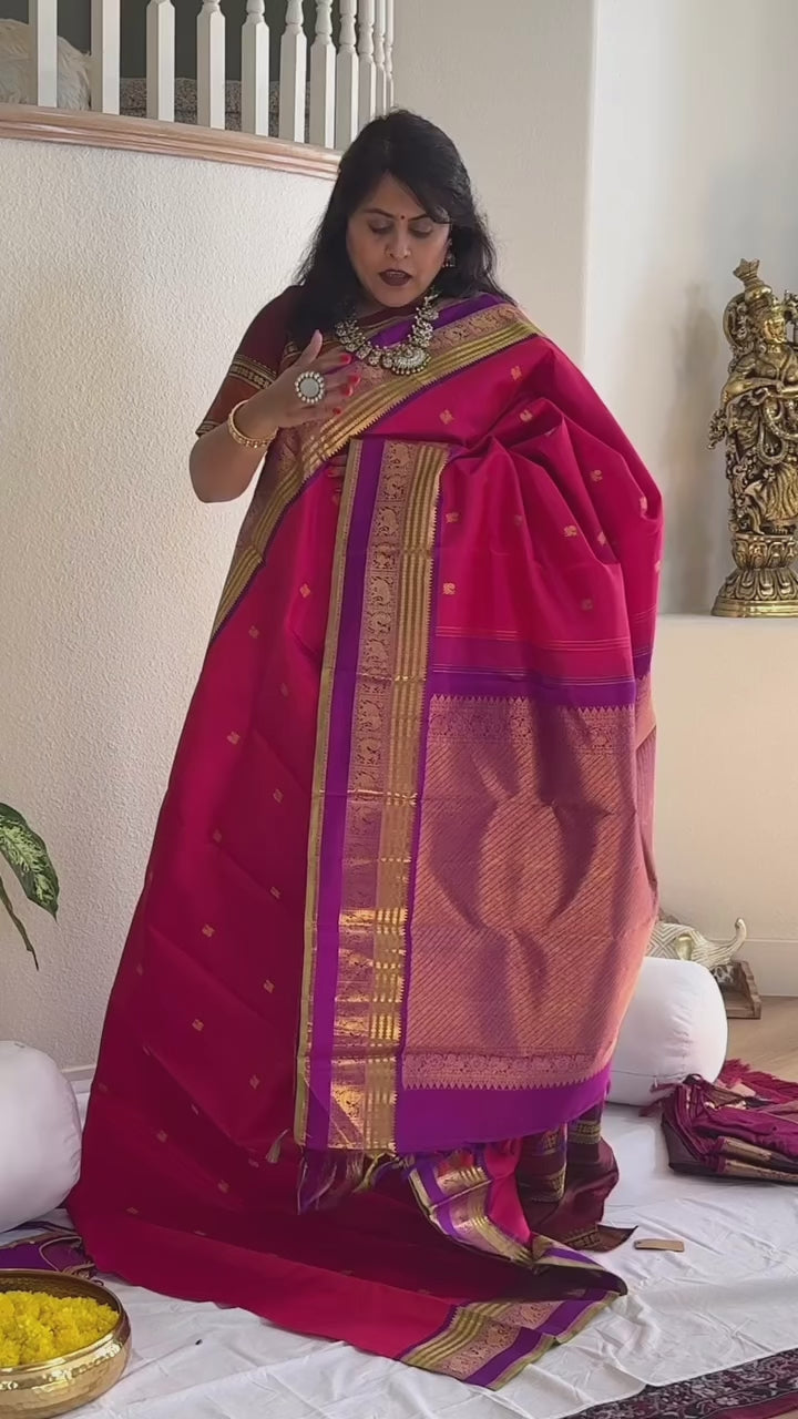Indulge in the elegance of our Kanjeevaram pure silk handloom saree in a stunning Pink purple hue. Handwoven with the finest silk, this saree exudes luxury and sophistication. Elevate your wardrobe with this timeless piece, perfect for any occasion. Saree comes with a blouse piece.