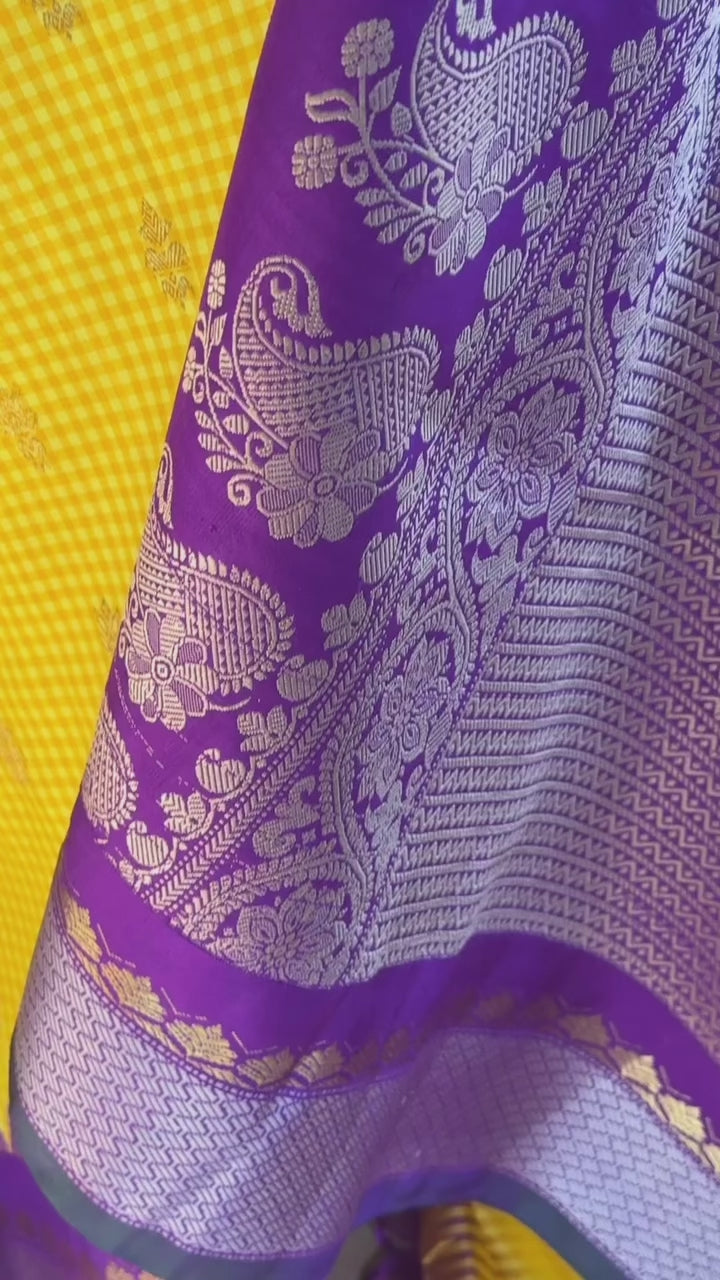 Discover the luxurious elegance of our Kuttu Gadwal Pure silk handloom saree in a stunning yellow with a regal touch of purple. Hand-crafted with the finest silk, this saree is a masterpiece that exudes sophistication and exclusivity. Elevate your style with this exquisite piece, perfect for any occasion.